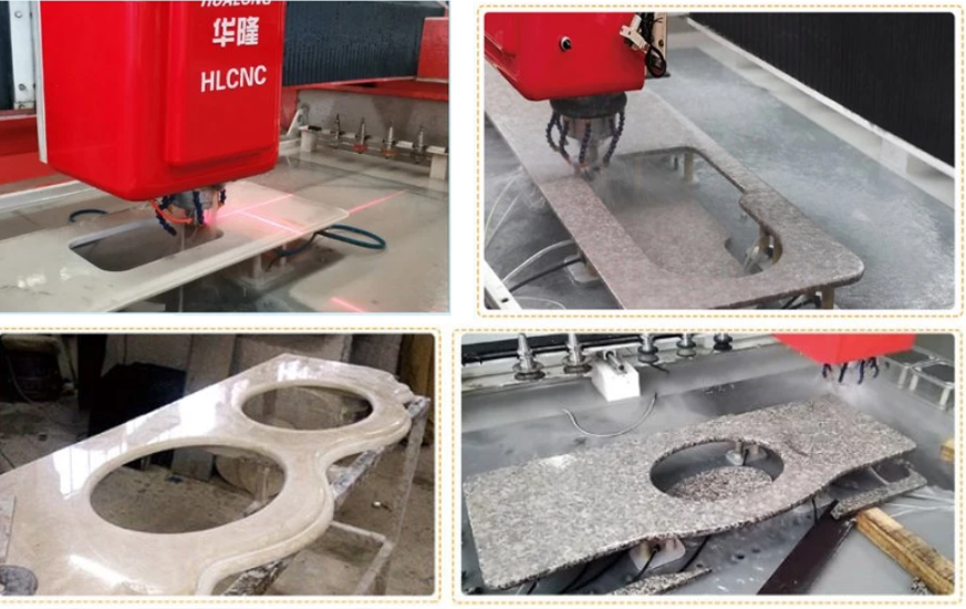 数控石材加工中心 : 是一个CNC铣削中心,设计用于轮廓加工、切削和车削,具有三个插补轴,为用户提供了多种复杂加工操作的可能性。适用于加工各种石材台面,如厨房台面、浴室台面、橱柜台面、吧台、桌子、窗台、门套等。浮雕像石头背景墙浮雕,欧式包边等也是可用的。